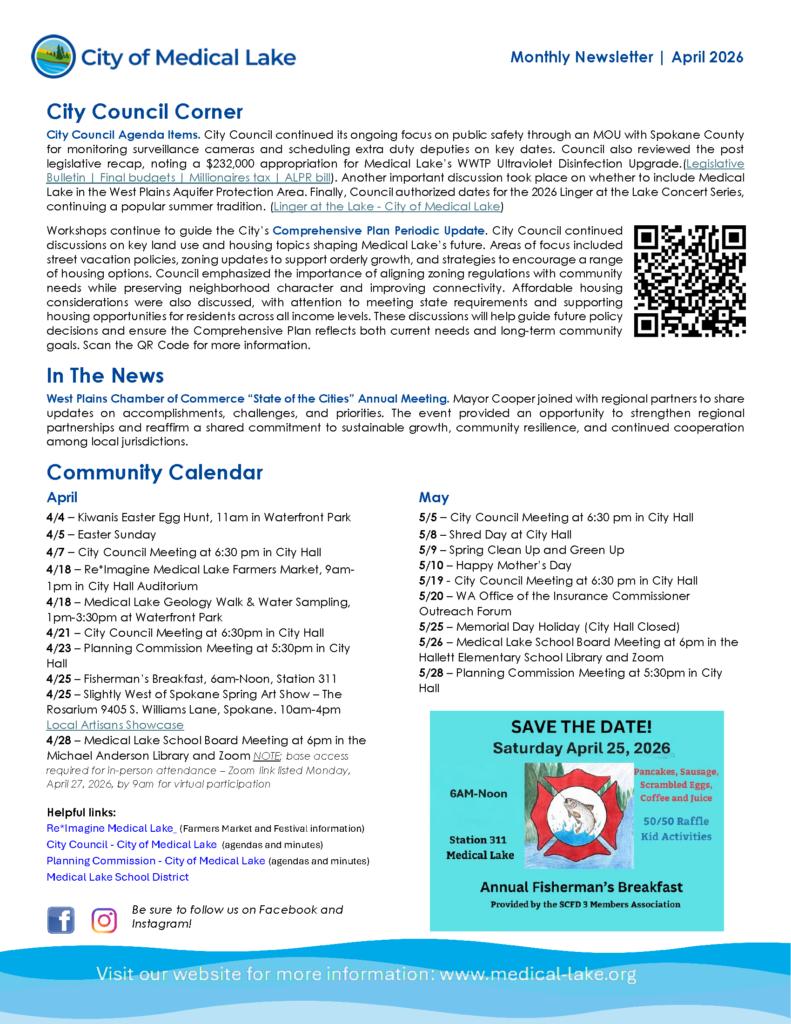 Want to know if there will be road closures, upcoming events, or to just stay in the know of everything that is going on in Medical Lake? Click here to sign up for our mobile alerts and updates and we will keep you in the know of everything that is happening in our wonderful city.